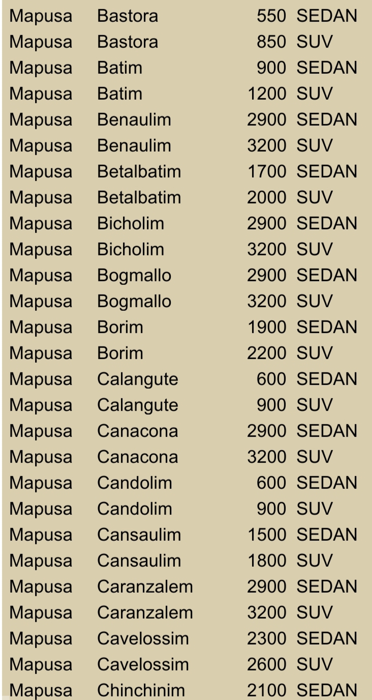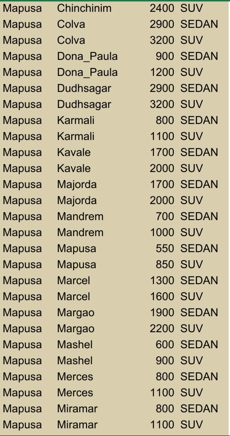 Taxi Fare Chart - Railway Station to Goa Destinations