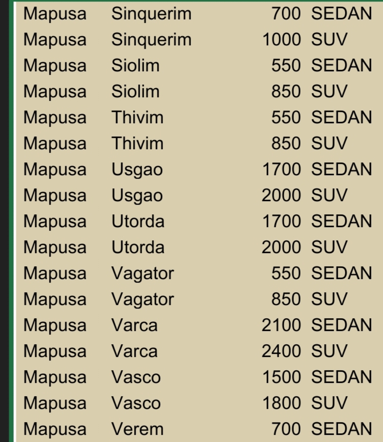 Mapusa to Bastora 550 850 Mapusa Batim 900 1200